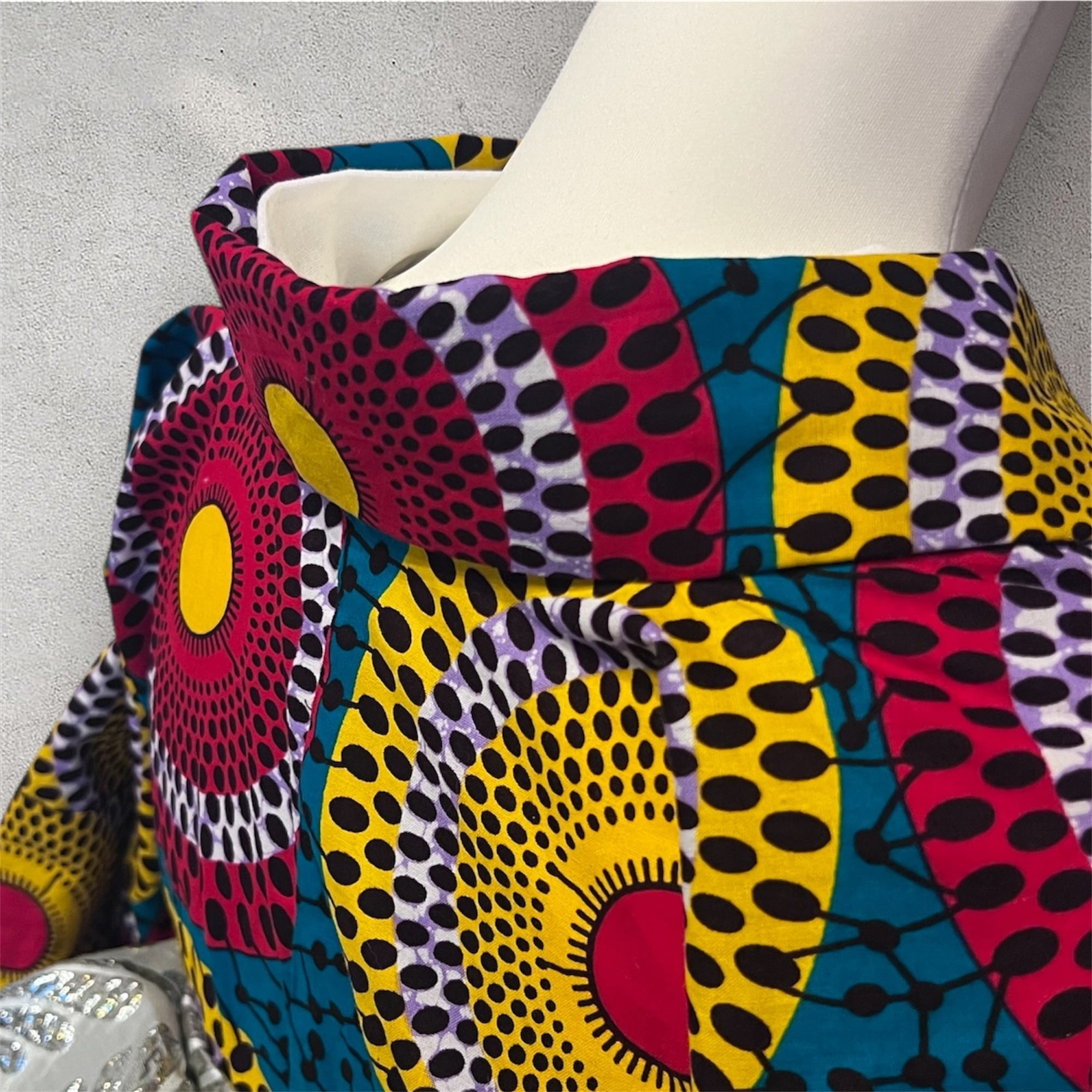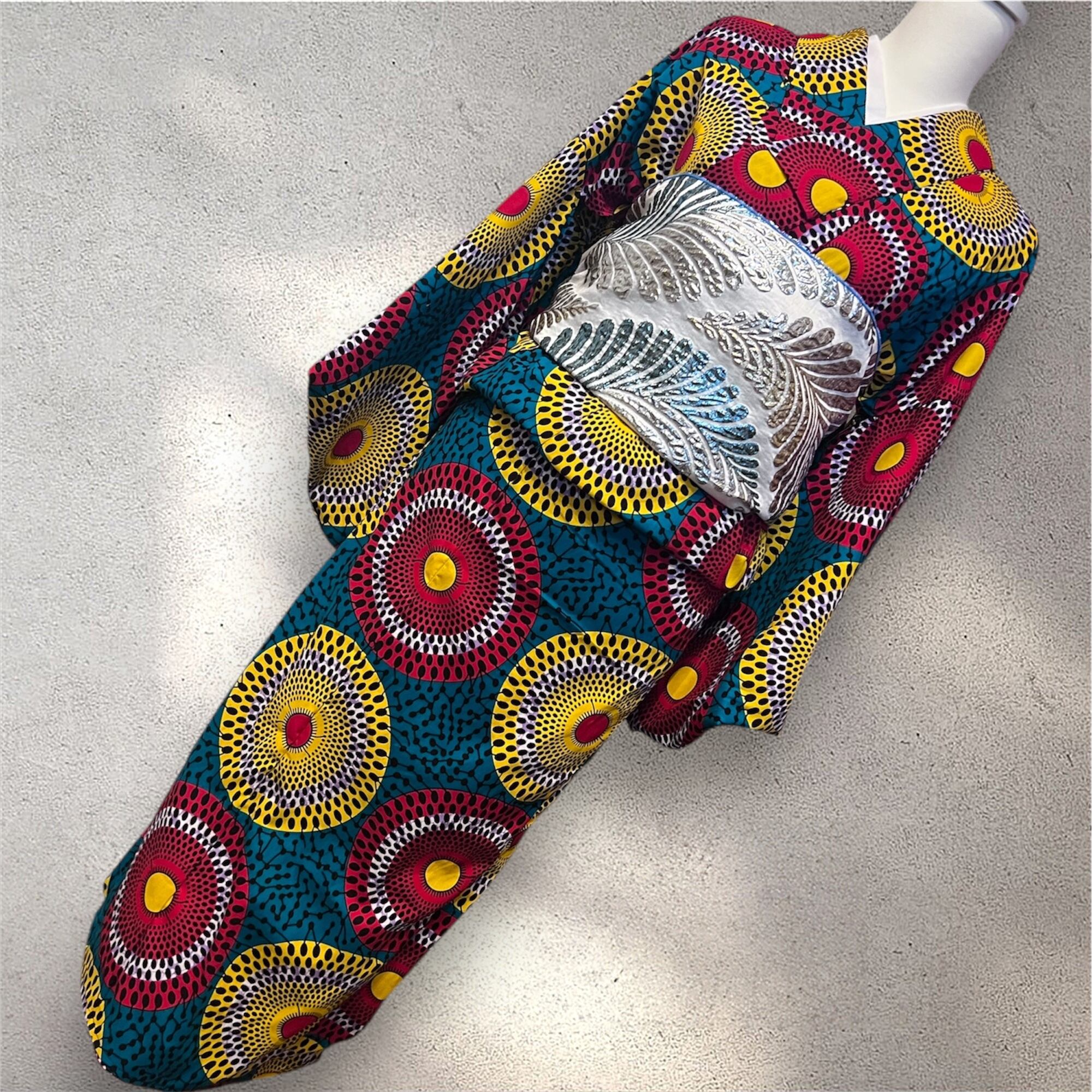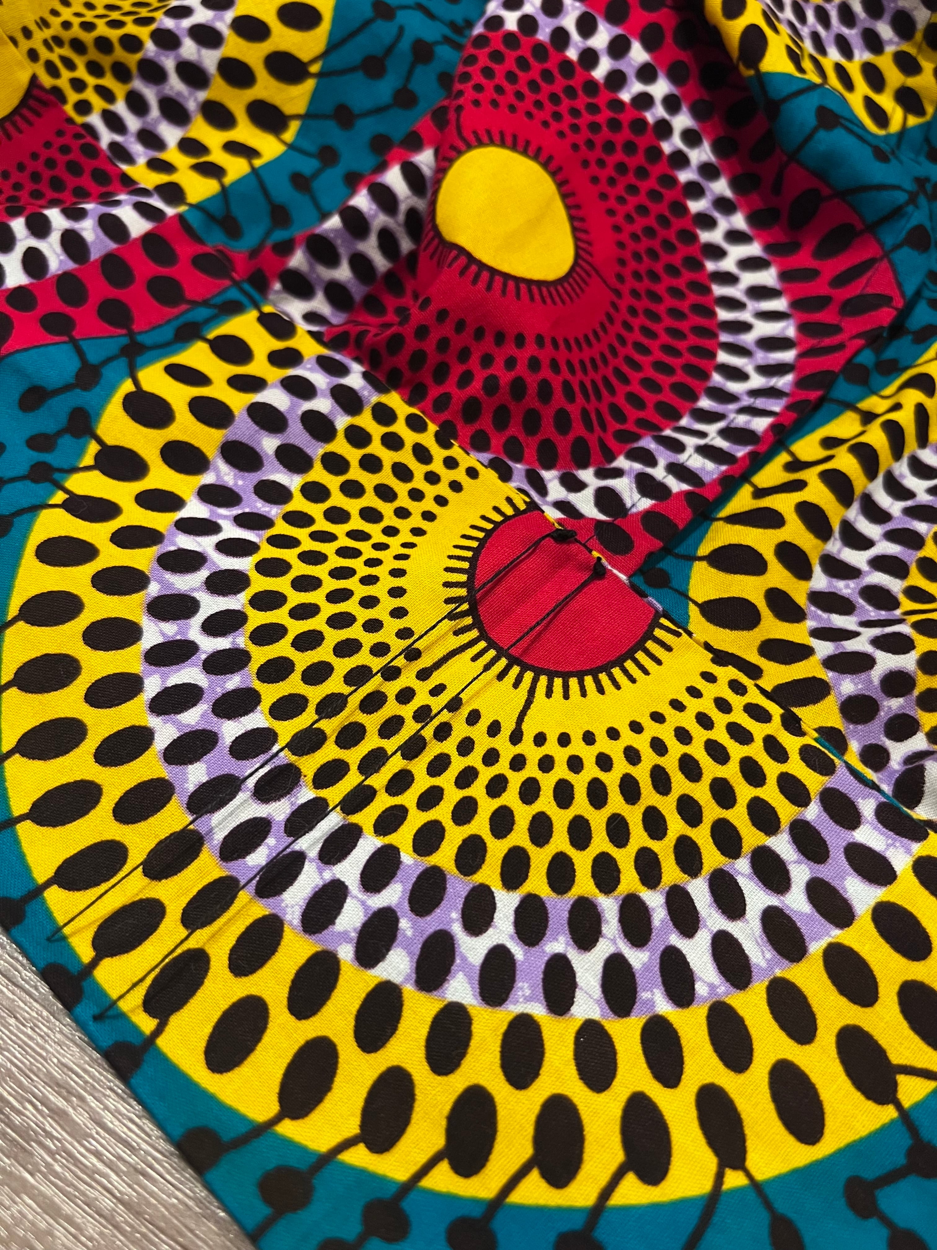 人気のアフリカンワックスの布で仕立てたカラフルな円形模様の浴衣です♪